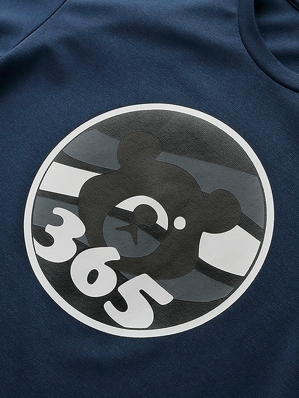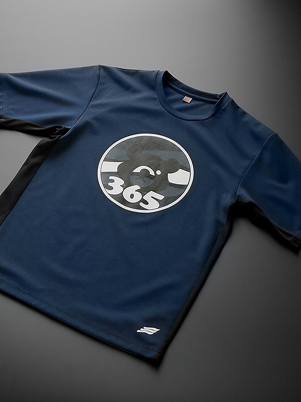 | 使用質感優良、光滑柔軟的雷射混合棉布。厚實且不易變形,具有適度的硬挺感。此外,此布料的吸濕性高,能有效減少悶熱感(棉60%、雷射35%、聚氨酯5%)。側邊部分使用通風良好的網眼布進行切換。 | 採用身部寬鬆的剪裁設計,提供放鬆舒適的穿著感受。 | 胸部大面積印有圓形HYOD365熊圖案。設計以365熊和徽章為主題。 |
