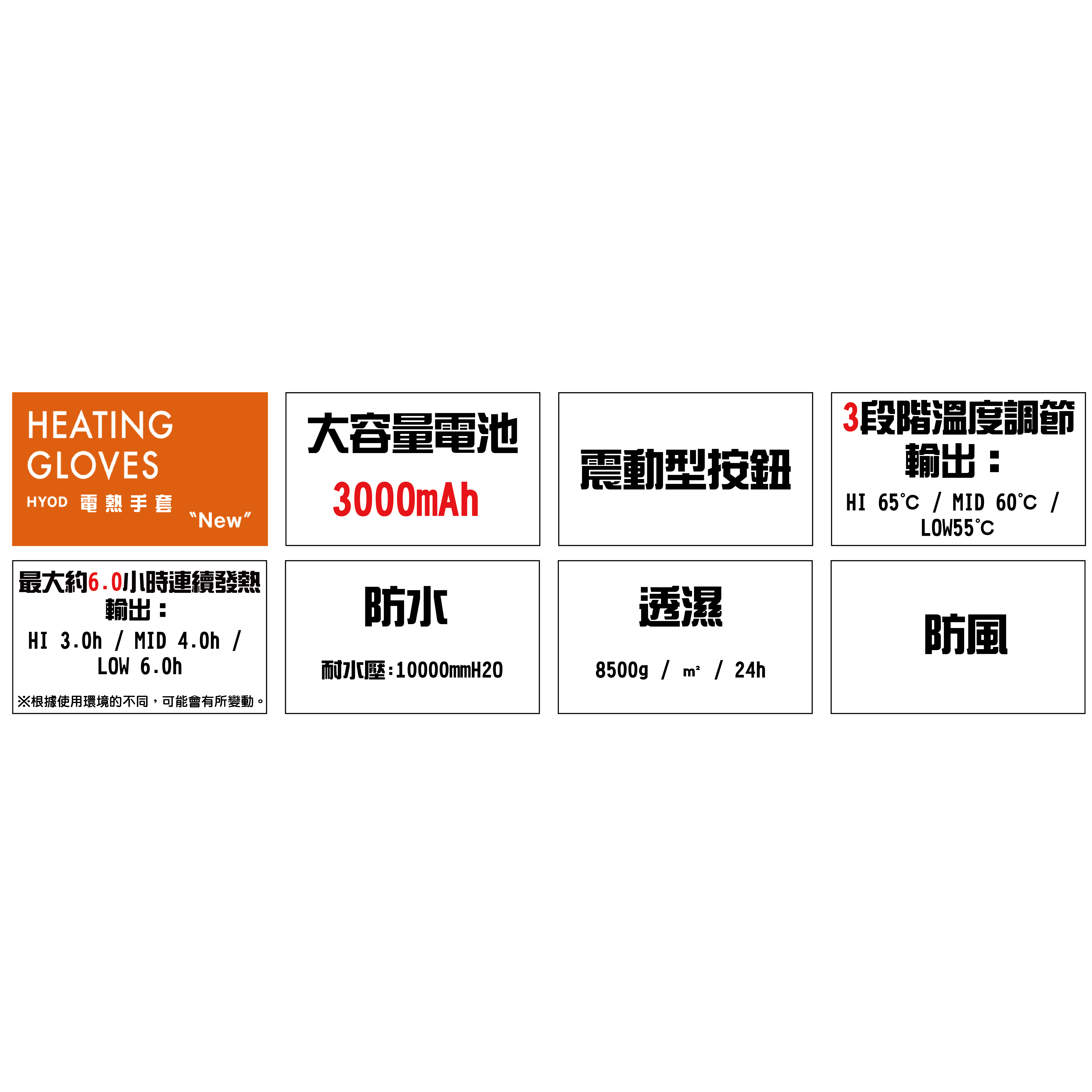 這款手套配備大容量3000mAh電池,採用矽膠按鈕可進行三段階溫度調節,最長可連續使用6小時。