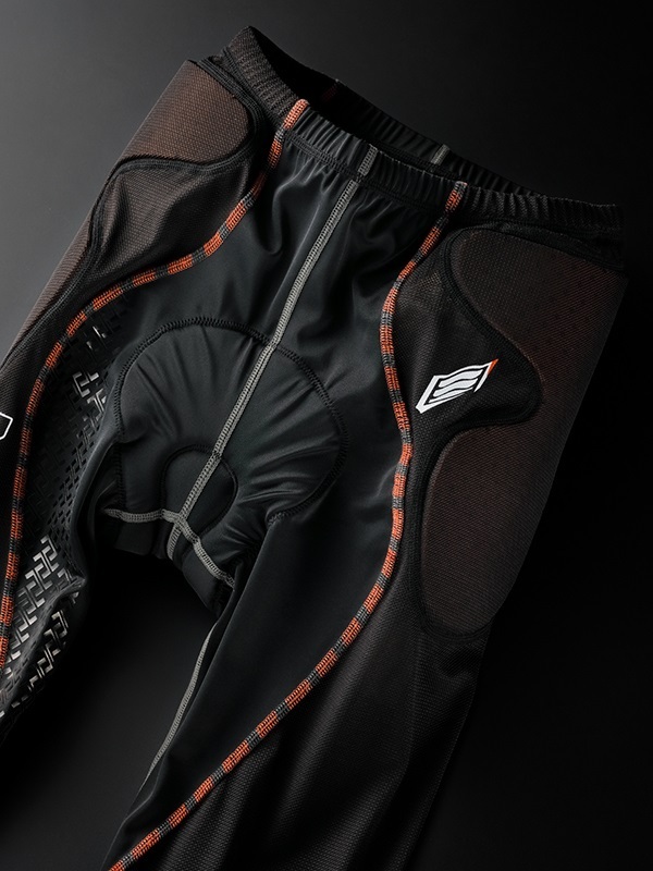 | 尾骨處裝備了D3O® LP1 L1(CE規格1級),腰側配有6mm厚的打孔網布烯烴墊,股部則配有減少震動的低反發墊。 | 膝部裝備了透氣性優秀的D3O® LP1 L1(CE規格1級)。 | 這是一條具備優秀吸汗速乾性的彈性護具長褲。 |