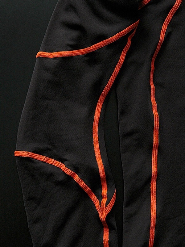 | 此款採用高彈性材質,提供適度的壓力感,並有效貼合身體曲線。其優越的運動適應性讓您在長時間騎行中感到舒適,減輕騎行疲勞累積,成為冬季騎行的理想選擇。 | 採用平縫技術確保接縫部分平整,減少摩擦與不適感。接縫設計不僅使布料貼合舒適,還能避免與護具的干擾,讓您在騎行時更加專注,並顯著提升穿著舒適度與表現力。 | 這款設計以黑色基底搭配橘色車縫線,兼具低調與運動風格,滿足不同騎士對於個性化的追求,展現騎士的獨特品味。 |