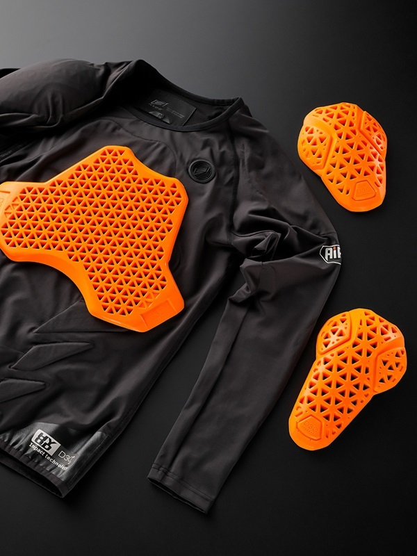 | 表面材質採用了具有彈性且有韌性的布料,內襯則使用了網布。前方的大圓形拉鍊設計便於裝上連身式胸部護具。 | 各部位的縫製均採用平縫技術完成。由於縫合時布料保持平整,使縫線呈現平滑狀態,從而減少疊穿時的不適感。 | 肩部和肘部配備了D3O® LP1 L1護具,胸部裝有一體式的D3O® CP1 L1護具,背部則配有D3O® BP4 L1護具(皆為CE規格1級)。作為基層穿著時,這些護具能與身體保護部位緊密貼合,並透過D3O®護具的卓越衝擊吸收能力,有效保護受到衝擊的部位。※CE規格是歐洲統一規範,現已成為國際標準的安全規範。 |