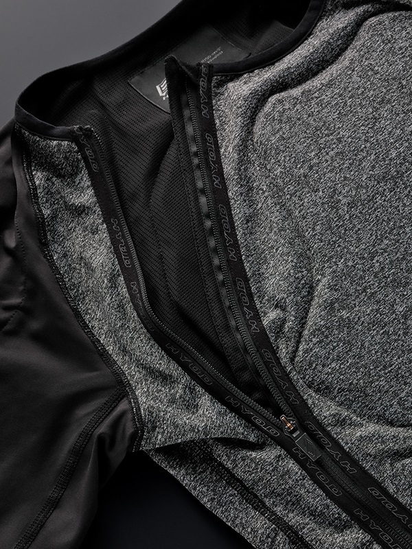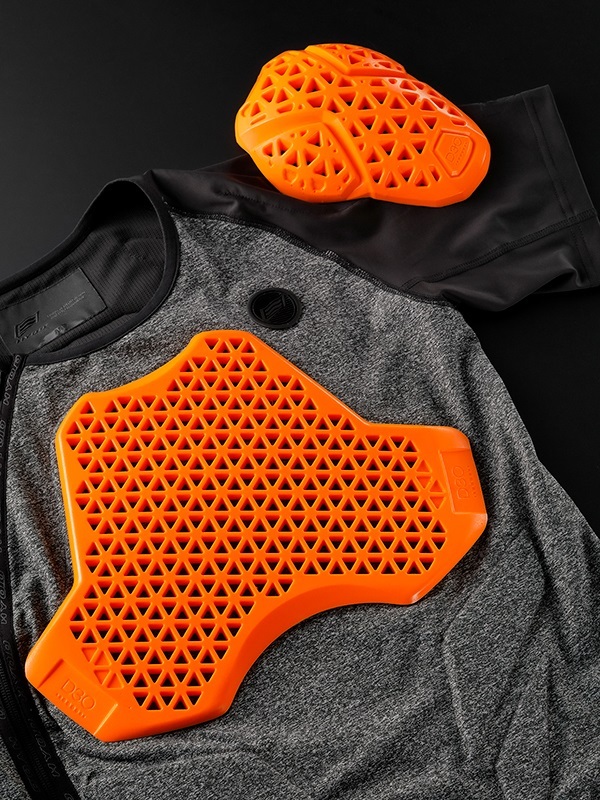 | 表面材質採用了具有彈性且有韌性的布料,內襯則使用了網布,前方則設計為大圓形拉鍊,以便裝上連身式胸部護具。 | 各部位的縫製均採用平縫技術完成。由於縫合時布料保持平整,使縫線呈現平滑狀態,從而減少疊穿時的不適感。 | 肩部配備了D3O® LP1 L1護具,胸部則裝有一體式的D3O® CP1 L1護具,背部則配備了D3O® BP4 L1護具(皆為CE規格1級)。作為基層穿著時,這些護具能與身體保護部位緊密貼合,並透過D3O®護具的卓越衝擊吸收能力,有效保護受到衝擊的部位。※CE規格是歐洲統一規範,現已成為國際標準的安全規範。 |