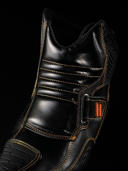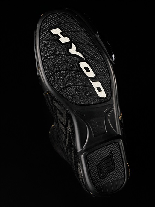 | 這是一款使用兼具強度與舒適性的防潑水皮革製成的靴子。 | 左腳背部配有耐磨性卓越的換檔墊。 | 採用了HYOD原創的注塑鞋底,具備優越的腳步操控性能。 |
