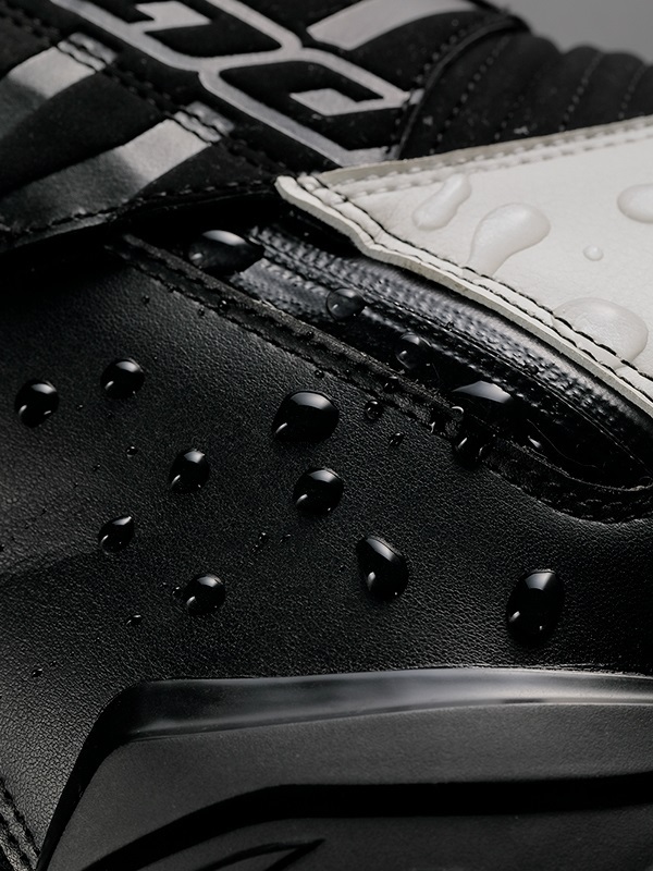 | 左腳配有換檔墊片,並且鞋尖外側裝有可更換的腳尖滑塊。這種設計不僅減少鞋體的損傷,還能應對激烈的騎行需求。 | 成型的後跟保護器增強了整個後跟的包覆感,能在意外摔倒時減少後跟部分的損傷。此外,後跟上方的紡織材料彈性部件也支持了腳踝的靈活活動。 | 腳踝的內外側都嵌入了柔軟且具彈性的D3O®保護墊。D3O®是一種保護材料,其分子能感知衝擊的強度並自動結合以吸收衝擊。在HYOD的賽車皮衣、夾克、褲子等多種產品中,都採用了D3O®保護墊。 |