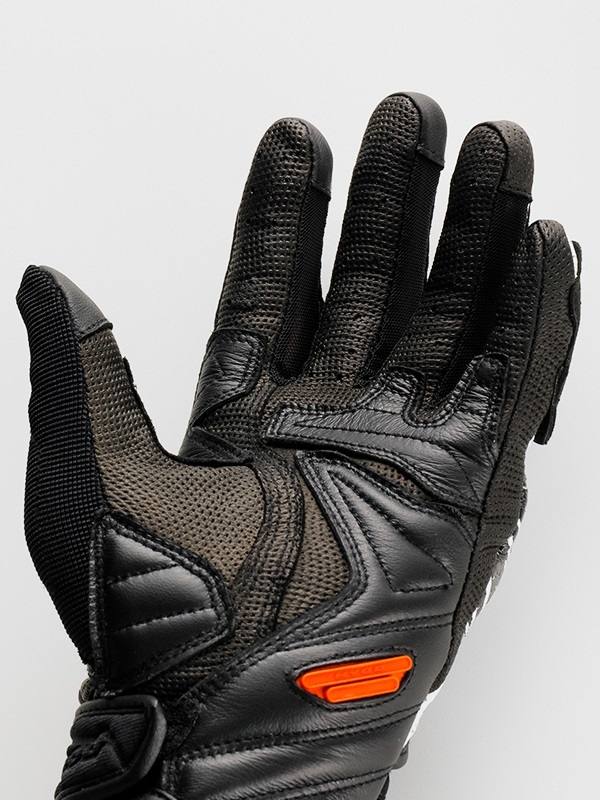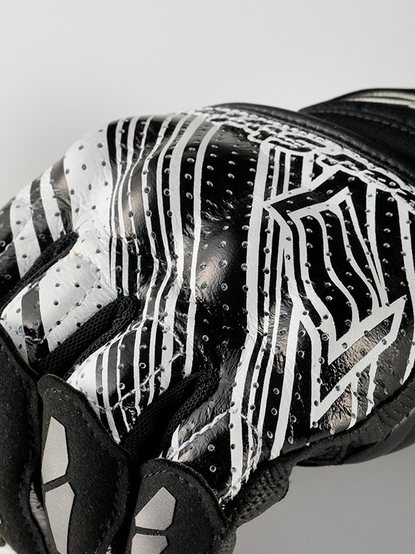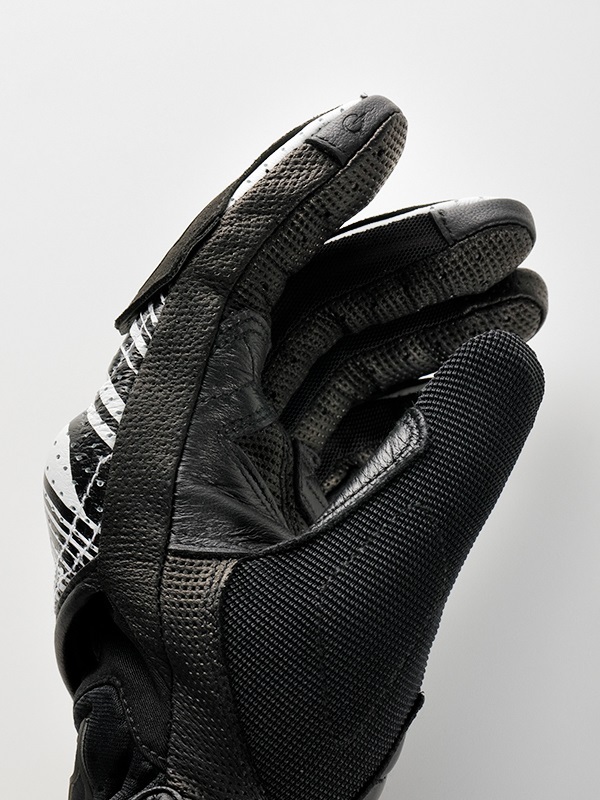 | 手背部分採用大膽的圖案印刷設計,內部嵌入了成形護具,兼具造型感與防護性能。 | 雙手的食指與中指指尖(側邊拼接處)以及拇指部分採用了觸控螢幕專用皮革,讓您在佩戴手套的狀態下也能輕鬆操作手機。 | 手掌部分採用了山羊皮(Goat Leather)作為材質,具有輕盈且堅韌的特性,觸感優異。經過壓紋加工處理,不僅止滑性佳,還能有效提升握把時的抓握力。除拇指以外的手指部位則施以透氣孔設計,有效減少悶熱感,提升長時間騎乘時的舒適度。 |