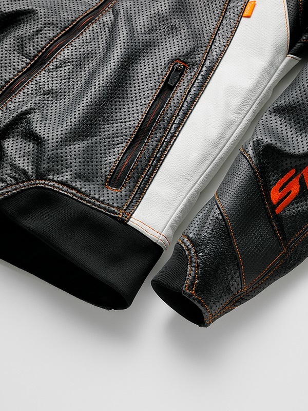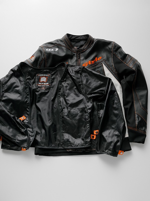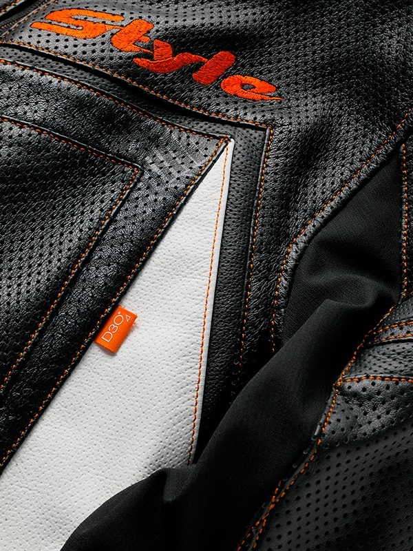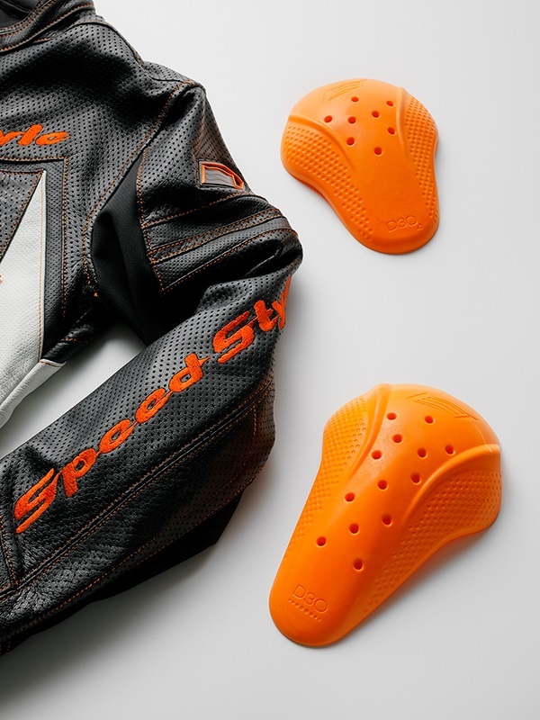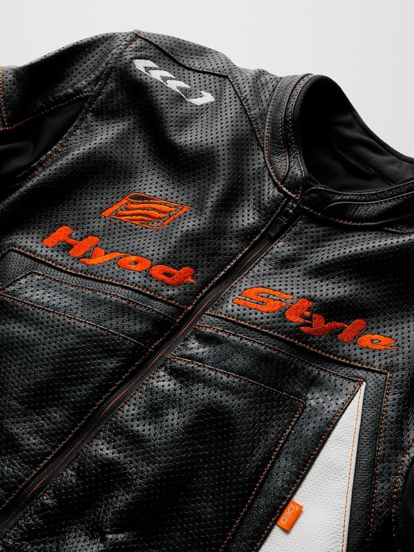 採用了柔軟的風合和舒適的穿著感的牛皮輕量皮革。我們對皮革進行了1.3mm的穿孔加工,以應對氣溫的上升。隨著穿著時間的增加,皮革會更好地貼合您的身體,這是高品質皮革模型特有的特徵。這件衣服會讓您有長久穿著的願望。 前面設計有「HYOD STYLE」和「HYOD CREST」兩種選擇。在前面標誌下方和雙袖上,皮革上印有圖形印刷,增添了細節上的亮點。 肩部和肘部配備了柔軟且具彈性的驚人衝擊吸收材料D3O®防護墊,兼顧了舒適的穿著感和高規格的安全性能。此外,背部標準配備了低反彈型的聚氨酯泡棉墊(也可以將聚氨酯泡棉墊升級為HYZ902或D3O® VIPER STEALTH背部保護墊,以提升保護性能)。所有D3O®防護墊均符合歐洲嚴格的安全標準「CE規範」。
