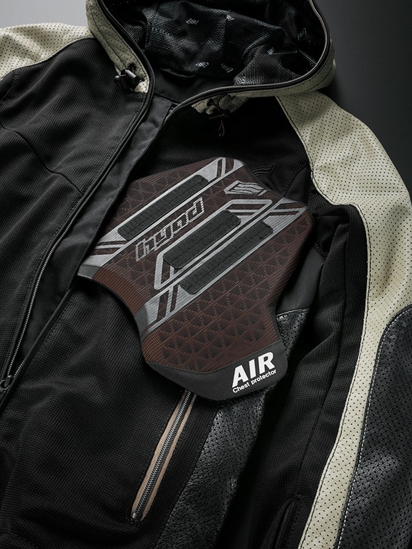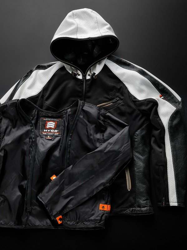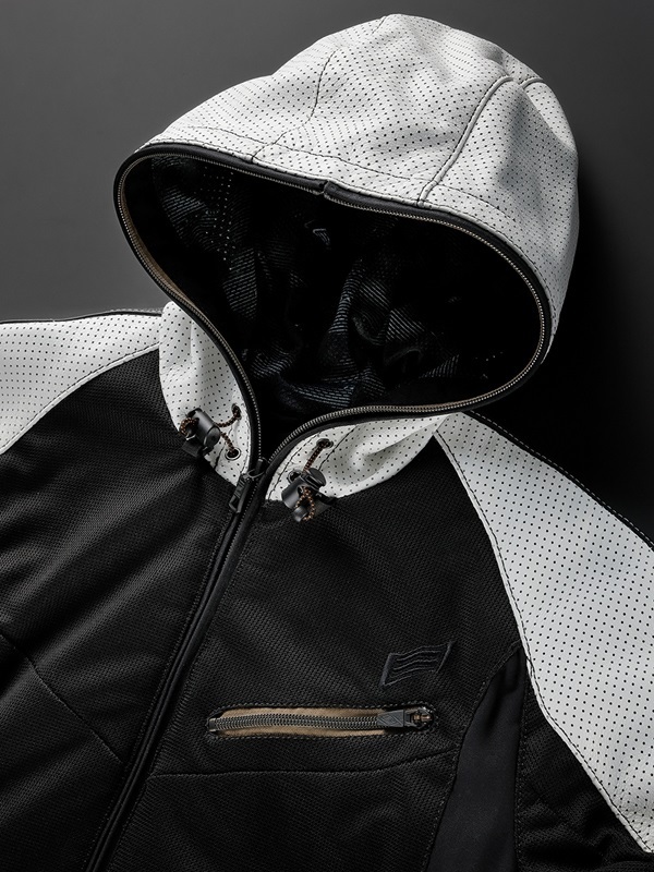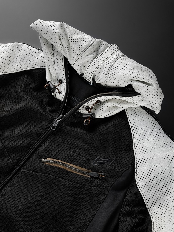跌倒時容易受損的肩部至手臂部分,採用了柔軟而有彈性的牛皮輕量皮革(直徑1.3mm的打孔加工);前身和後身則使用了輕量、高強度且通氣性良好的紡織網布。這樣的設計實現了「輕盈」、「安全」和「舒適」的完美平衡,打造出一款混合材質的皮革服裝。 夾克內側配備了可拆卸的防風內襯。由於採用了拉鍊和按扣設計,使得內襯可以輕鬆拆卸。無論是應對一天內的氣溫變化,還是長時間的季節穿著,都能保持舒適。 如果高速行駛時覺得帽子部分有擺動問題,可以將帽子本體折疊得更緊湊。這種帽子可以根據高速公路行駛等場景或個人喜好和場合進行調整,是帽子款式的一大特色。