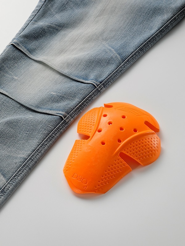 | 使用了吸汗速乾性優異的Coolmax材質,保持乾爽和舒適的穿著感。面料為彈性牛仔布,剪裁上從膝部到褲腳逐漸收窄成錐形風格。 | 內裡前側與皮膚接觸的部分裝有吸水性和速乾性優異的聚酯纖維網眼內襯,即使在夏季騎行時也能減少褲內因汗水造成的黏膩感。建議在夏季搭配具有吸汗速乾功能的增強型內褲,以提供更舒適的穿著體驗。 | 膝部標準配備了衝擊吸收力和佩戴感優秀的D3O®護具(可拆卸)。可以根據體型進行上下兩段階的調整。由於護具具有柔軟且靈活的特性,為穿著者帶來了舒適性、設計美感以及剪裁等多方面的優點。 |