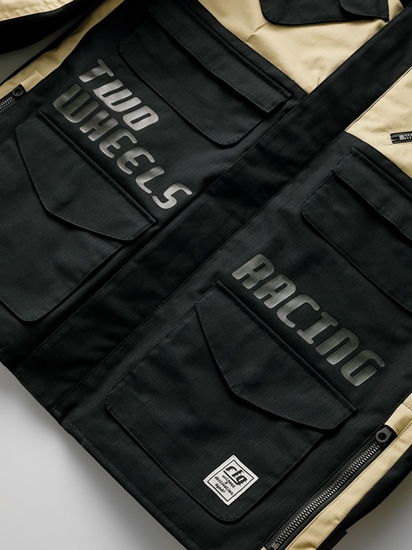 | 身幅寬鬆的寬版方格圖案以及前身的方形口袋細節,靈感來自於軍裝外套(Fatigue Jacket)。背部的活動摺痕以及適度立體化的肘部設計,有助於順暢的騎行動作。 | 左胸上有Rambling徽章,前身則印有“TWO WHEELS RACING”的字樣。這些細節設計以及HYOD Rambling獨特的標誌使用風格,展現了其特色。 | 寬鬆剪裁的下擺側邊和袖口處,配有刺繡“rambling”標誌的調節器。這樣的設計在不影響剪裁線條的情況下,兼顧了功能性和設計感。 |