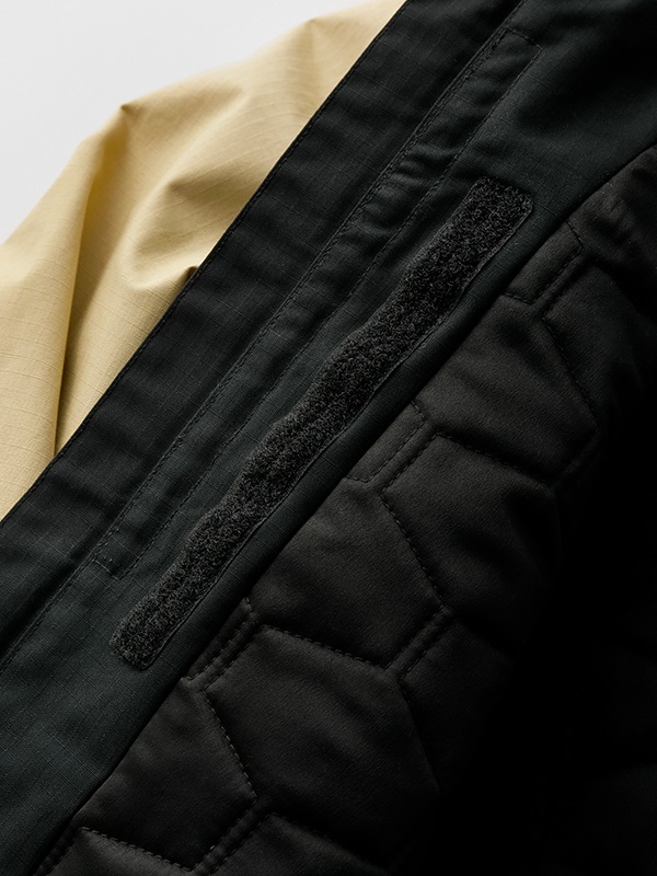| 採用了3M公司的高功能中綿材料——“3M™ Thinsulate™”。這種材料通過微細的纖維結構實現了優異的保溫性,是一種薄且輕便、保暖性極佳的理想保溫材料。內襯則採用了絎縫圖案處理。 | 這款外套內側設有安裝HYOD D3O®胸部護具的附件(魔鬼氈)。一體式胸部護具可以在兩個位置固定,分離式護具則可以在左右各一個位置固定。 |