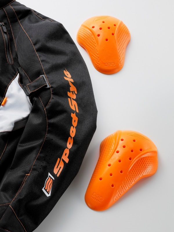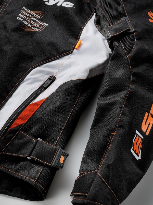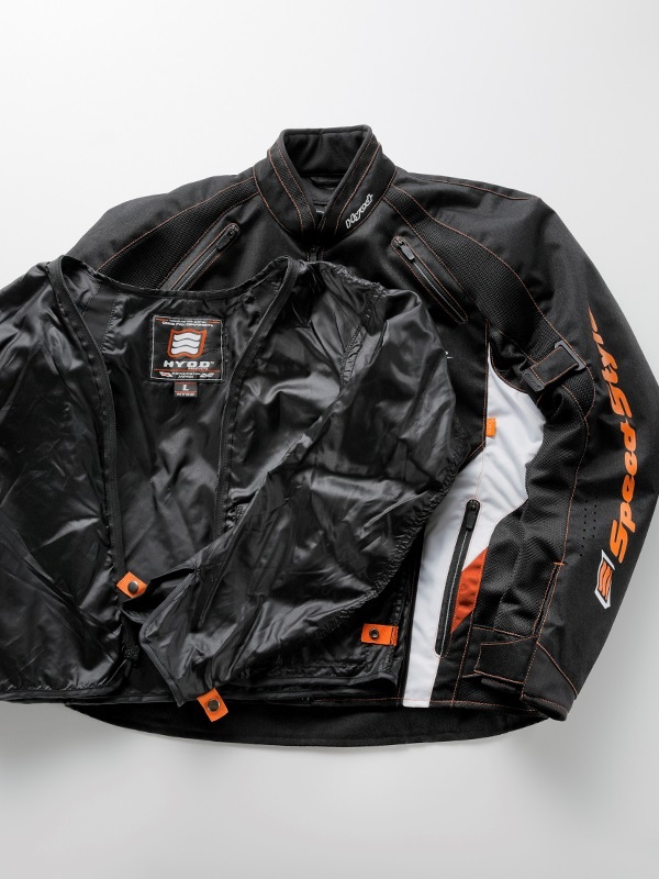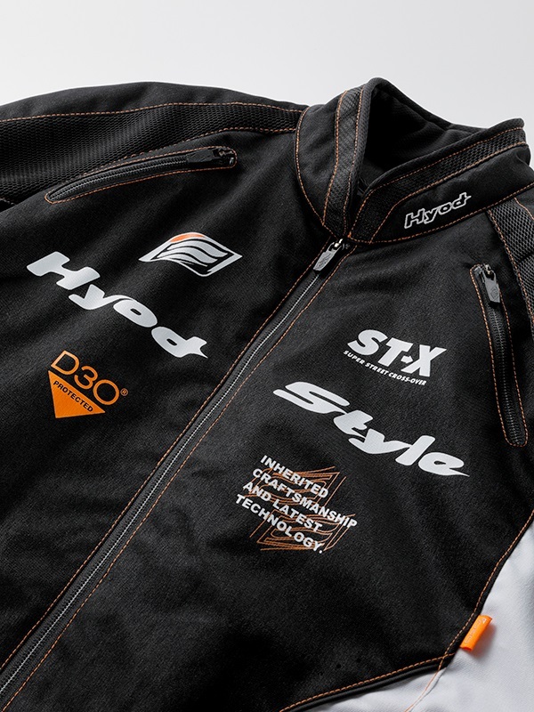| 內部設有HYOD D3O®胸部防護墊的附件(魔鬼氈),一體式胸部防護墊可在兩處固定,分體式則在左右各一處固定。 | 雙袖上刺繡有SPEED STYLE質感標誌,前身印有在紡織材料服裝上廣受好評的“SPEED-iD”設計。HYOD徽章、ST-X標誌、HYOD STYLE與SPEED STYLE標誌以酷炫且華麗的方式呈現。 | 上臂與腰側部分配備了黏扣帶調節器,能有效防止高速行駛時的抖動並調整夾克本體的貼合感。這是Speed Style概念服飾的一個性能部件。 |
