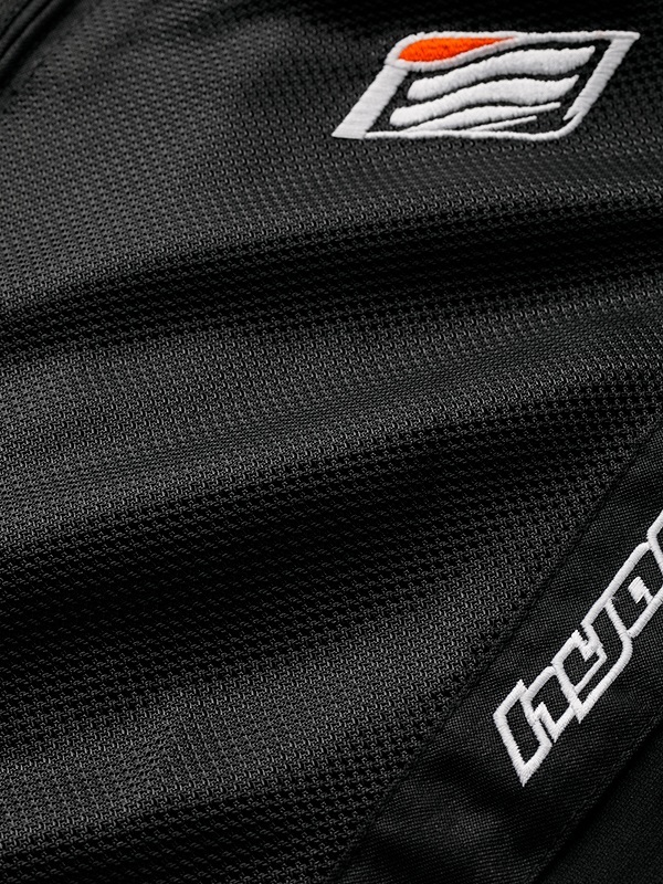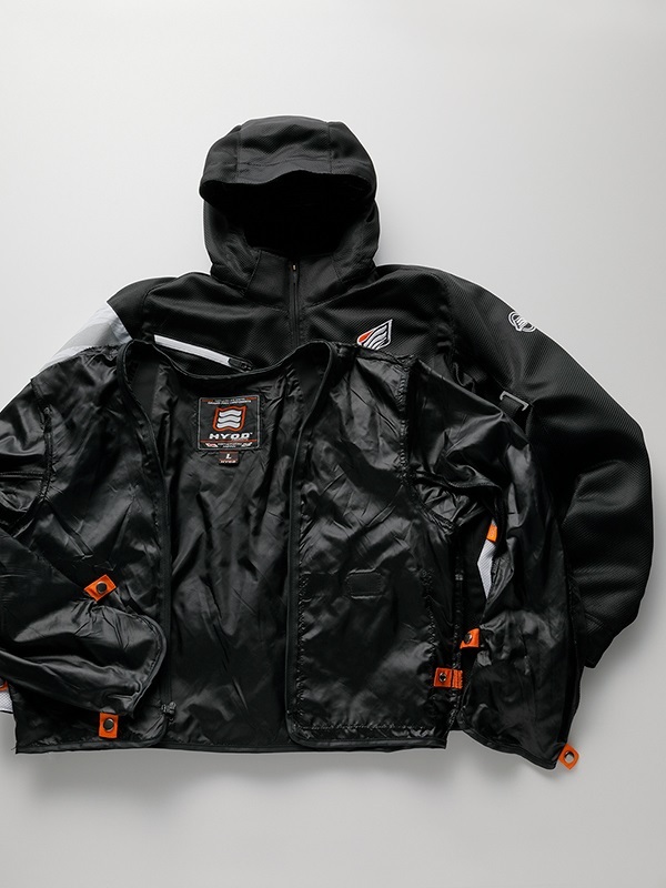 | 拉鍊連接的帽子可以拆卸。當在高速行駛時感到帽子部分的擺動令人不安,或希望大幅改變夾克的外觀時,可以根據個人喜好和場合進行調整,這也是連帽夾克的一大特色。 | 具有適度彈性、輕巧柔軟且強度優異的紡織網布,能在行駛時減少擺動,並具有卓越的通風性。 | 肩部和肘部配備了柔軟且具有彈性的D3O®防護墊,這種材料具備驚人的衝擊吸收能力,能同時提供舒適的穿著感與高規格的安全性能。此外,背部標準配備了高回彈性的聚氨酯泡棉墊(也可以從聚氨酯泡棉墊升級為HYZ902或D3O® VIPER STEALTH背部保護墊,以提升保護性能)。D3O®防護墊均符合歐洲嚴格的安全標準「CE規範」。 |