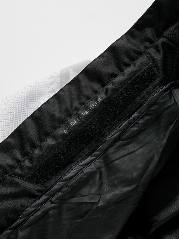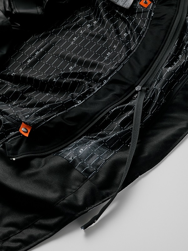 | 夾克內側配備了可拆卸的防風內襯。由於採用了拉鍊和按扣設計,因此可以輕鬆拆卸,不僅適應一天內的溫度變化,還能在較長的季節中保持舒適穿著。 | 夾克內側配備了用於安裝HYOD D3O®胸部保護墊的黏扣帶附件。一體式的胸部保護墊可以在兩處固定,兩片式模型則可以在左右各固定一處。 | 該夾克配備了通過拉鍊將夾克和褲子連接在一起的運動套裝系統。這個系統的拉鍊長度是通用的,即使夾克和褲子的尺寸不同,也能連接在一起。這有助於防止夾克上卷,並在摔倒時提高安全性。 |