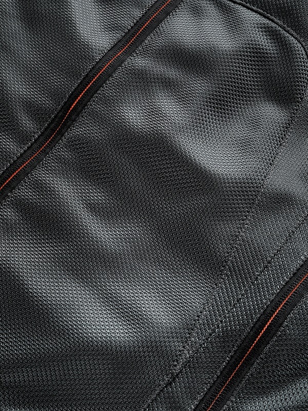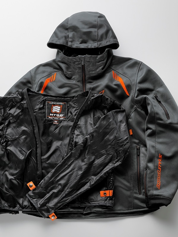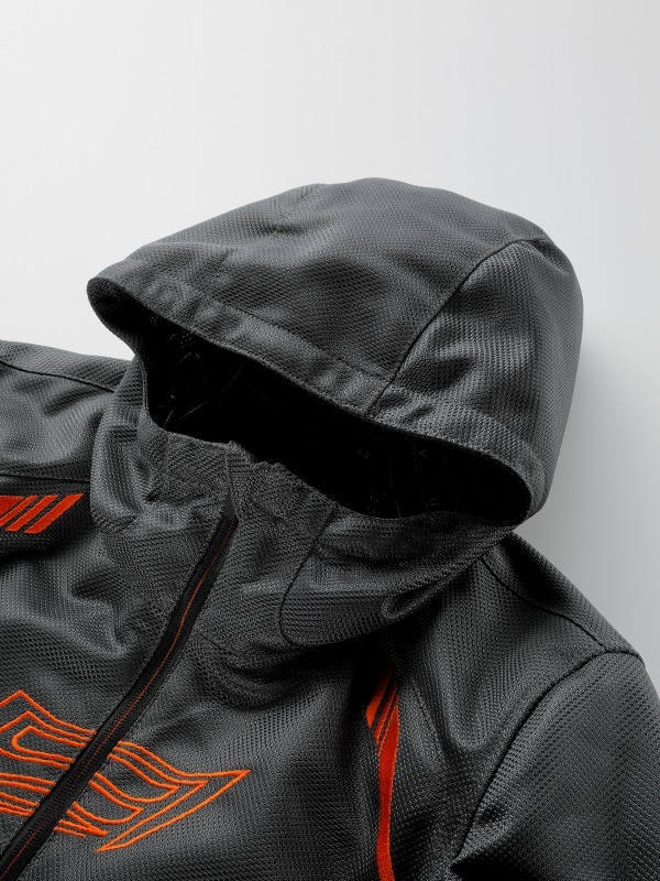 | 胸部設有刺繡的徽章標誌。胸部徽章有兩種設計:一種是直接展示徽章,另一種是以線條圖形表現徽章。提供兩種顏色的實色型和四種顏色的線條型選擇。 | 前面的拉鍊可拉到帽子高度。若高速行駛時擔心帽子部分的擺動,可以將帽子本體緊湊地折疊起來。這也是帶帽風格的一個特點,可以根據高速公路行駛場景、自身喜好或TPO進行調整使用。 | 採用高級感的紡織材料和有效引導空氣的高強度亮面II網布。不僅表面布料具備良好的透氣性,內襯則採用速乾性優異的HYOD標誌空氣網布。 |