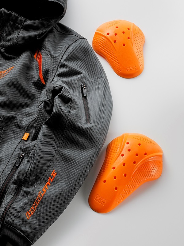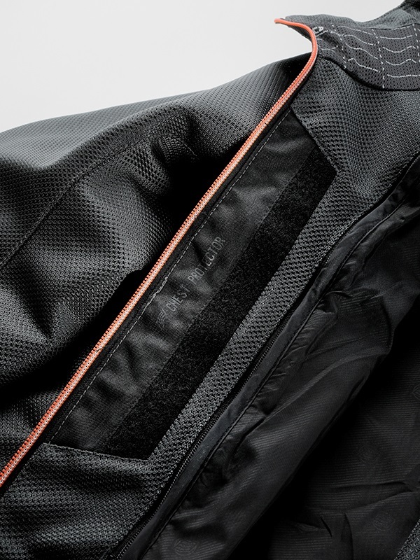 | 內部設有可拆卸的防風內襯,通過拉鍊和按扣可輕鬆拆卸,因此無論是一天中的溫度變化,還是長時間的季節變換,都能保持舒適。 | 肩部和手肘裝備了柔軟且靈活的D3O®防護墊,兼具舒適的穿著感與高規格的安全性能。背部標配高回彈型的聚氨酯泡棉墊(可從聚氨酯泡棉墊升級為HYZ902・D3O® VIPER STEALTH脊椎防護墊以提高防護性能)。D3O®防護墊均通過嚴格的歐盟CE安全標準。 | 內部設有HYOD D3O®胸部防護墊的附件(黏扣帶),一體式胸部防護墊可在兩處固定,分體式則在左右各一處固定。 |