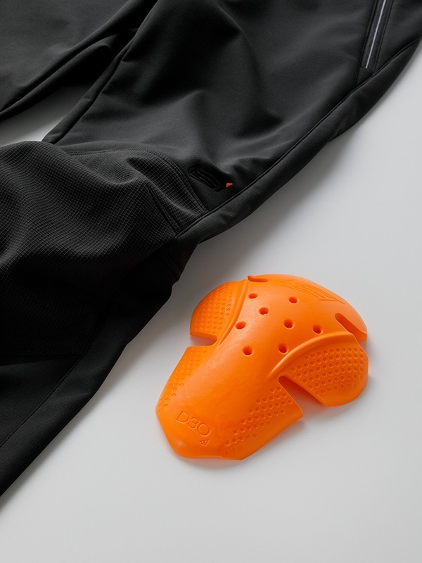 | 膝部設有褶皺設計,呈現立體造型。這樣的設計不會妨礙膝部的活動,同時也能更容易地保持騎乘姿勢。 | 膝部標準配備了具有優秀衝擊吸收力和裝載感的D3O®護具(可拆卸)。護具袋的上下兩段式位置調節設計,能根據個人身型進行調整。由於這款防護墊柔軟且具靈活性,帶來了舒適的佩戴感受,同時也保留了設計和剪裁上的許多優點。 |