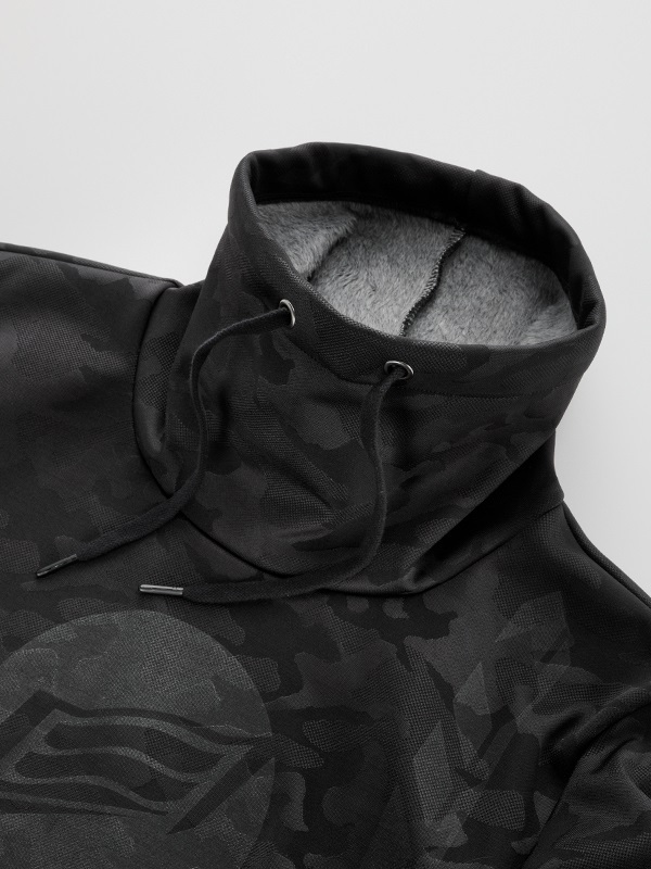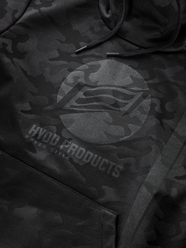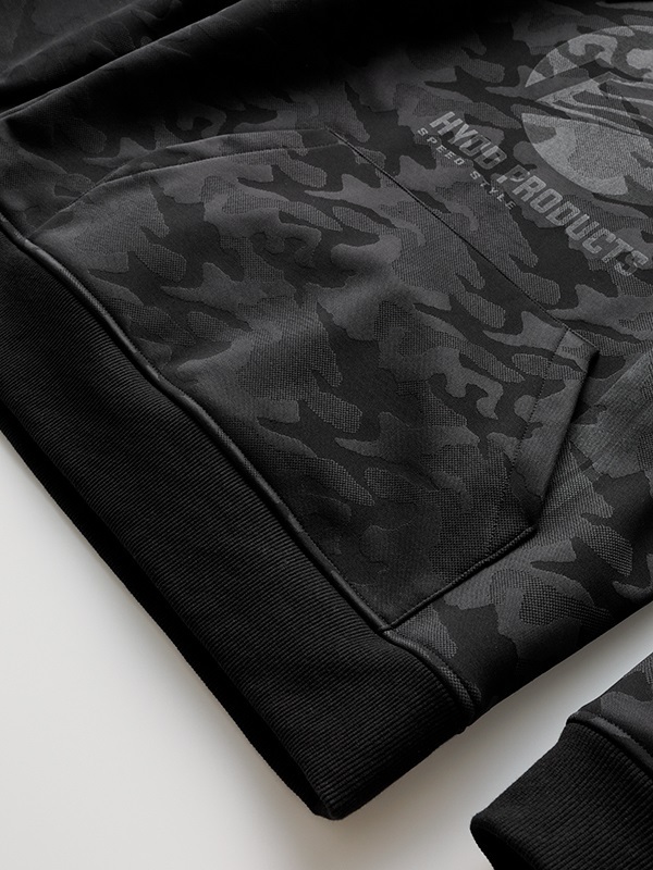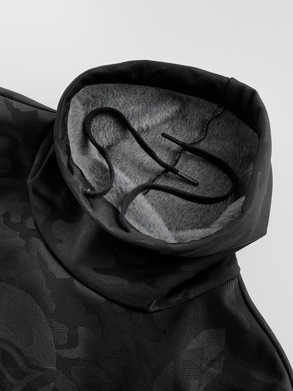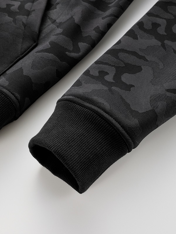 外層布料採用立體感強烈的迷彩提花織紋(Jacquard camouflage),兼具質感與機能。